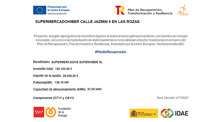 Noviembre 2025- BM Supermercados ha instalado una planta solar fotovoltaica en la cubierta de la tienda situada en el Centro Comercial La Marazuela (Las Rozas, Madrid), para autoconsumo, que ha contado con la financiación de la Unión Europea, a través de los fondos europeos Next Generation EU. La instalación cuenta con una potencia de generación de 136,2 kWp y una potencia nominal de 100 kWn, y dispone de un sistema de almacenamiento mediante baterías.